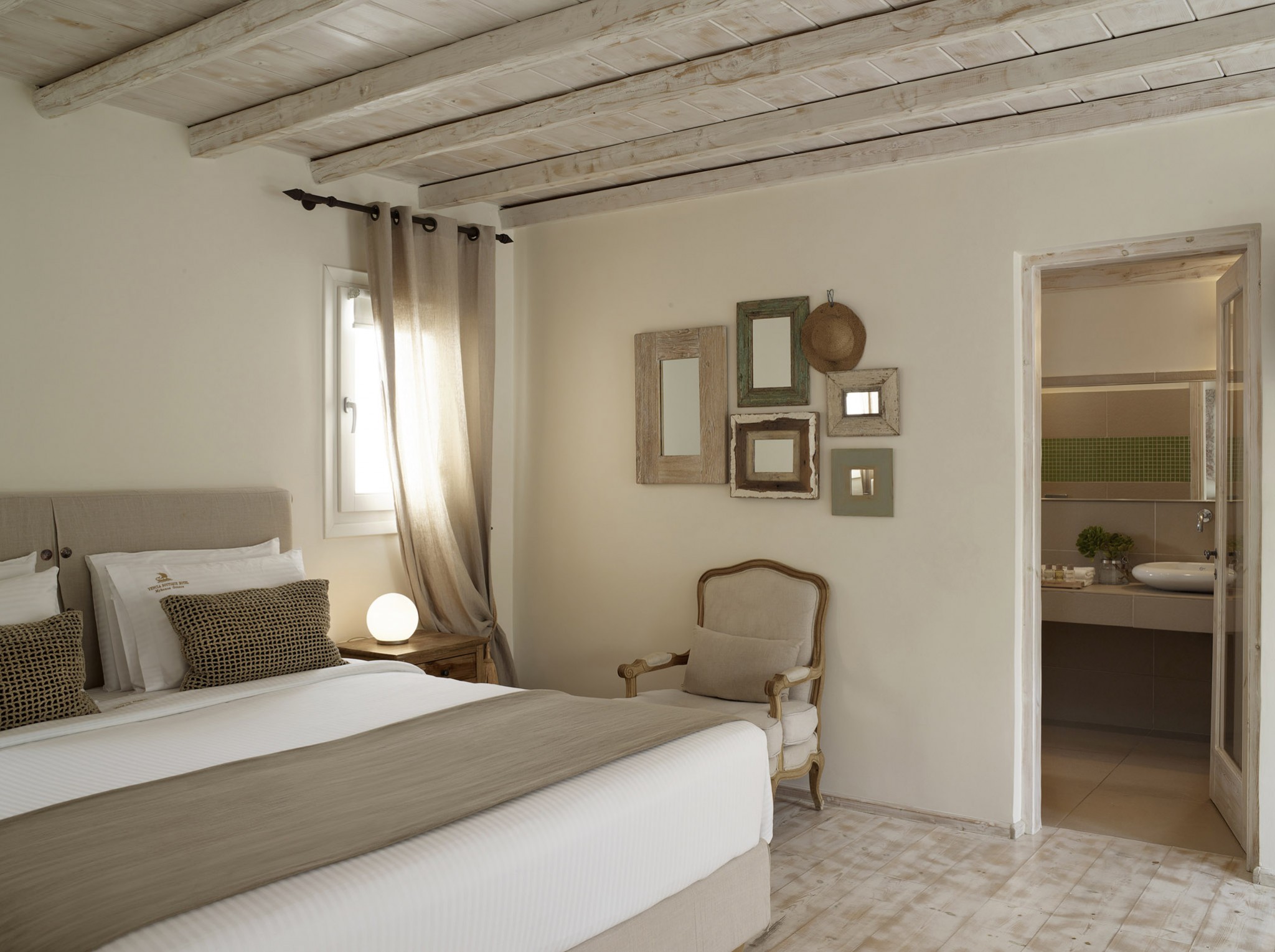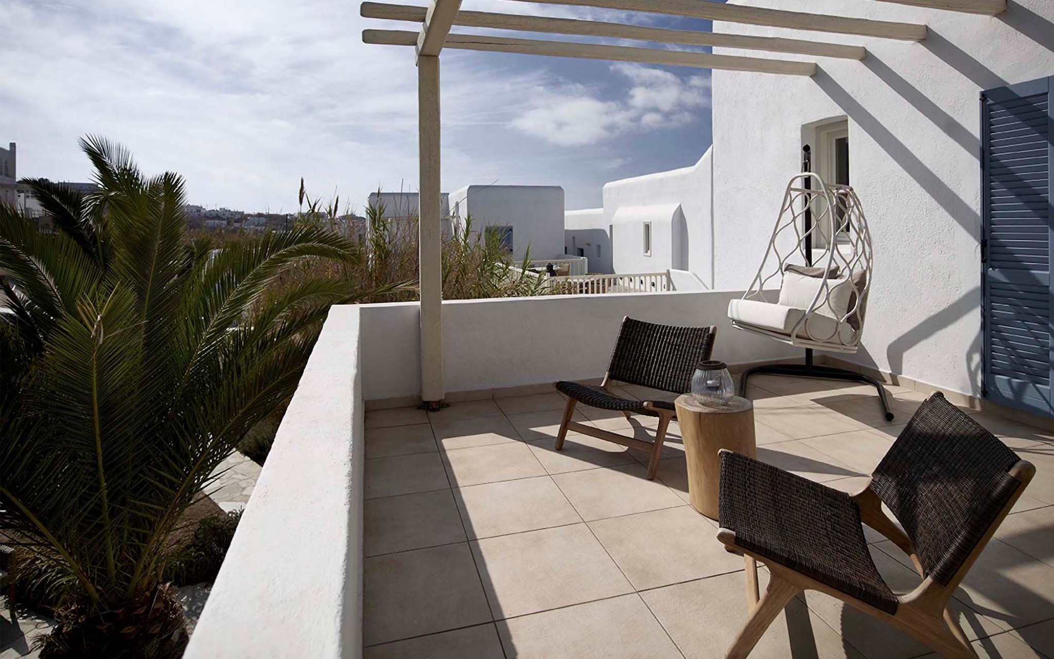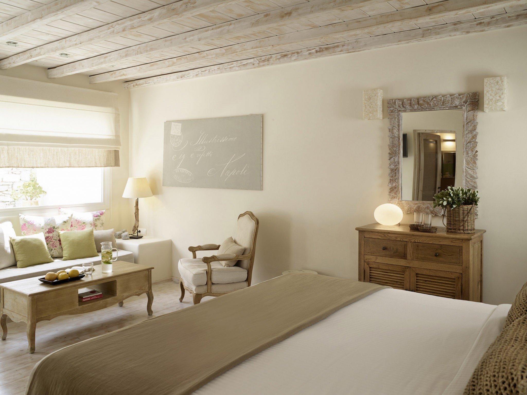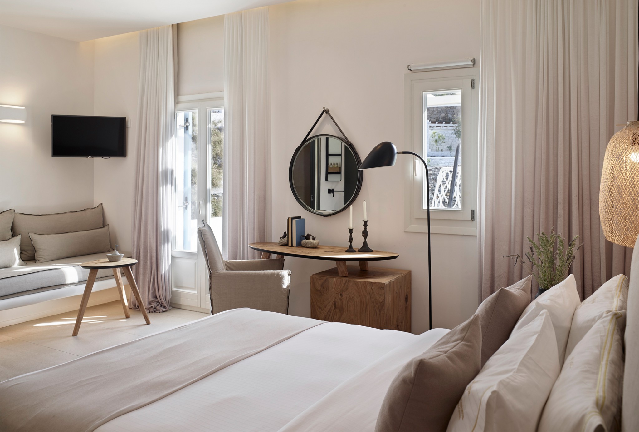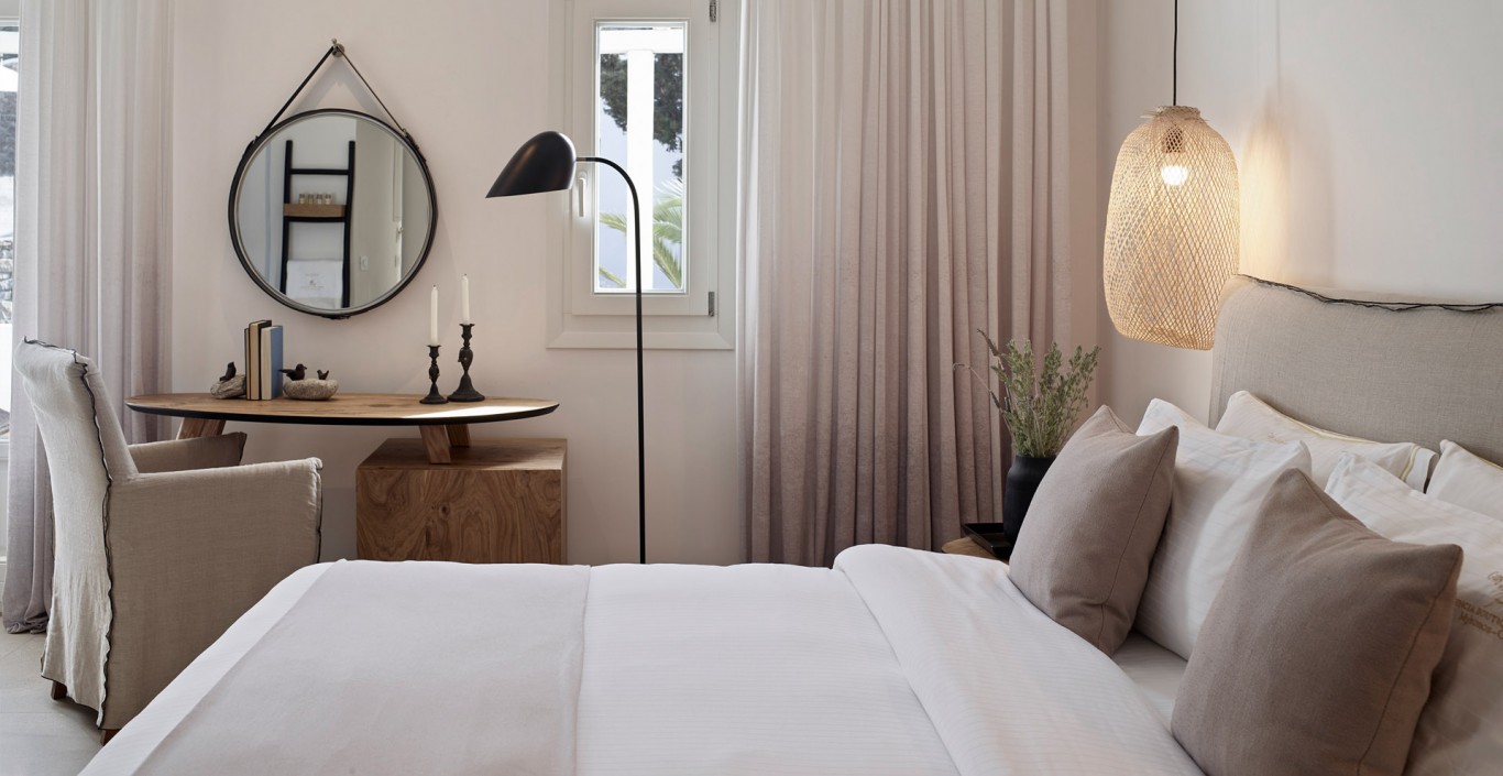 Relish the unique accommodation provided by modern and fully refurbished suites, feeling rejuvenated while lying leisurely on your private veranda. The interior of our suites is elegant, bright and decorated in a Cycladic style with modern twists and invitingly comfortable furniture. You will find a queen size bed and a bed sofa at the same area of the suite.