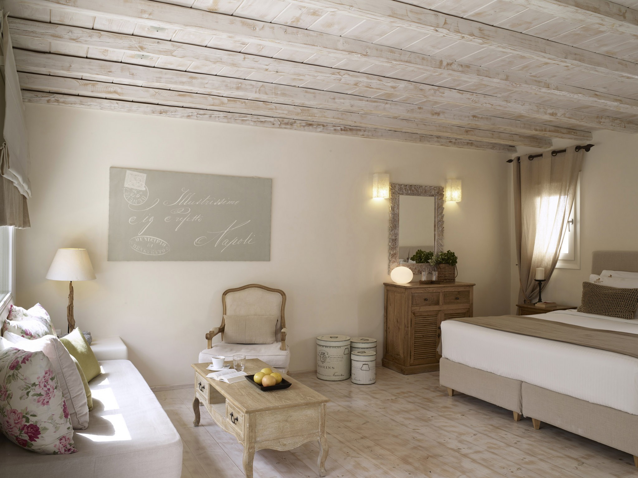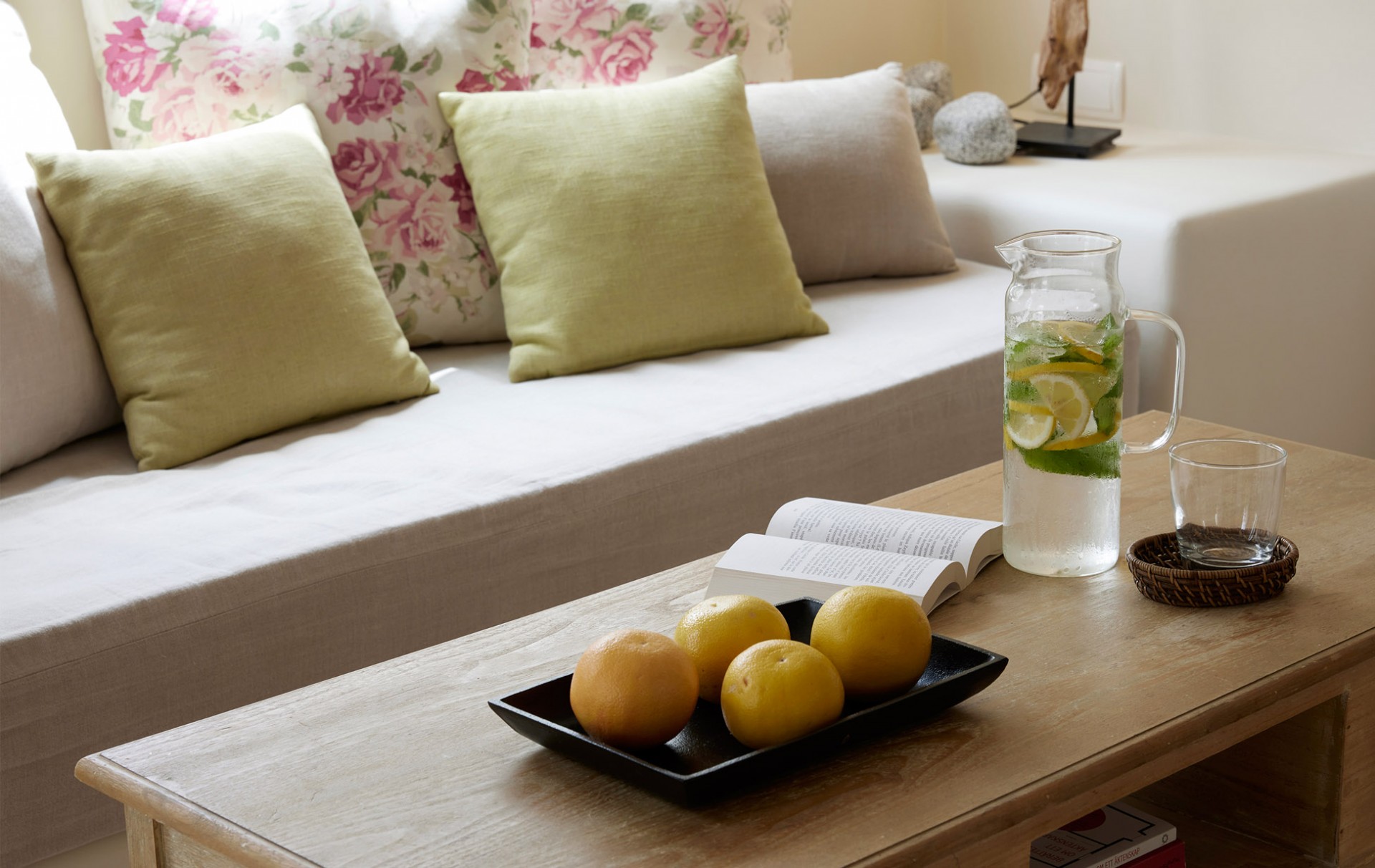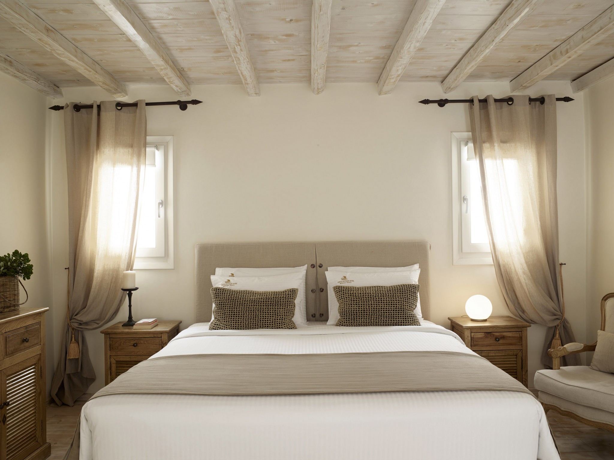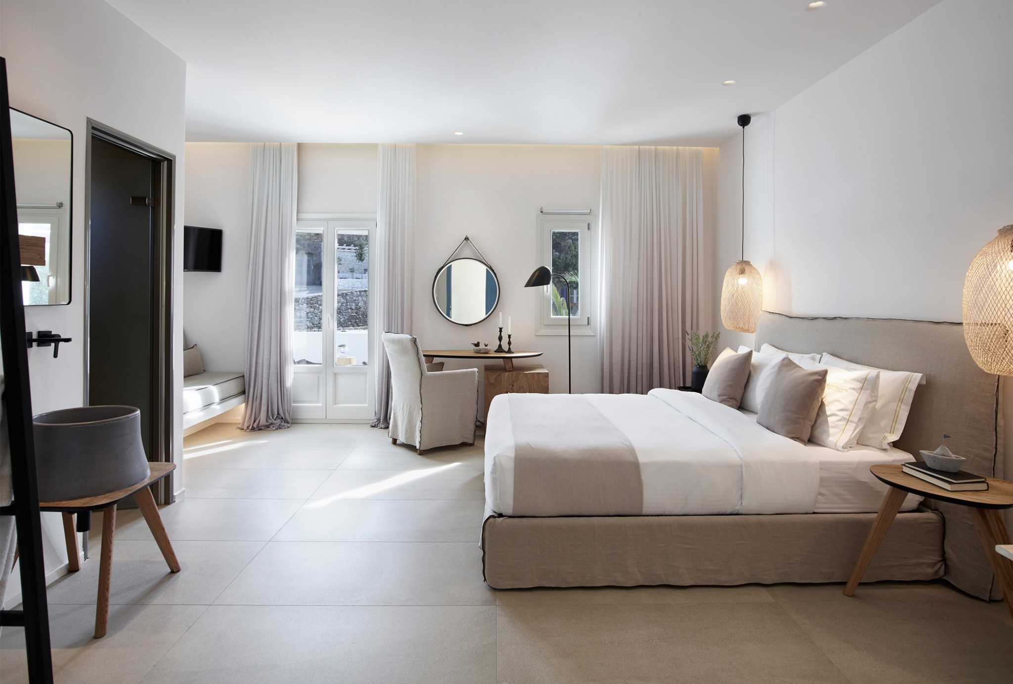 Relish the unique accommodation provided by modern and fully refurbished suites, feeling rejuvenated while lying leisurely on your private veranda. The interior of our suites is elegant, bright and decorated in a Cycladic style with modern twists and invitingly comfortable furniture. You will find a queen size bed and a bed sofa at the same area of the suite.